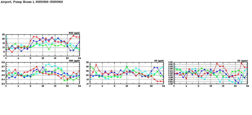 | Air Quality Data Time Series in Airport, Pump House 1 (2020/09/19) | ( Line colors: Day -3 Day -2 Day -1 Current day ) | 2D Map Current AQHI |