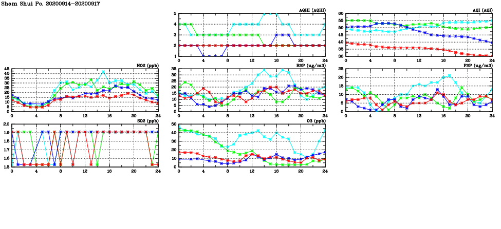 | Air Quality Data Time Series in Sham Shui Po (2020/09/17) | ( Line colors: Day -3 Day -2 Day -1 Current day ) | 2D Map Current AQHI |