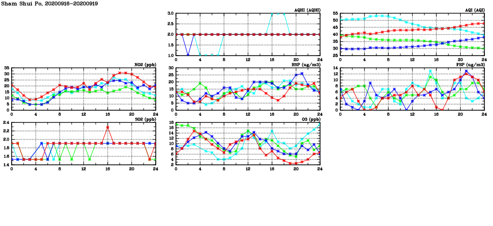 | Air Quality Data Time Series in Sham Shui Po (2020/09/19) | ( Line colors: Day -3 Day -2 Day -1 Current day ) | 2D Map Current AQHI |