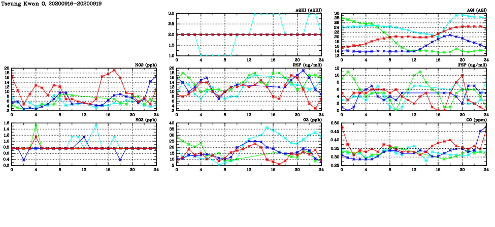 | Air Quality Data Time Series in Tseung Kwan O (2020/09/19) | ( Line colors: Day -3 Day -2 Day -1 Current day ) | 2D Map Current AQHI |