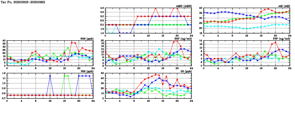 | Air Quality Data Time Series in Tai Po (2020/09/21) | ( Line colors: Day -3 Day -2 Day -1 Current day ) | 2D Map Current AQHI |