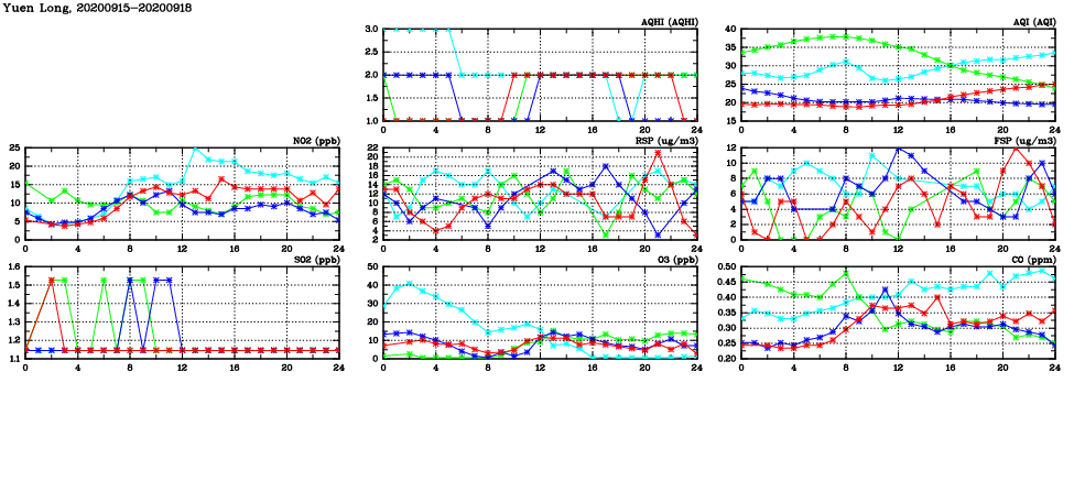 | Air Quality Data Time Series in Yuen Long (2020/09/18) | ( Line colors: Day -3 Day -2 Day -1 Current day ) | 2D Map Current AQHI |