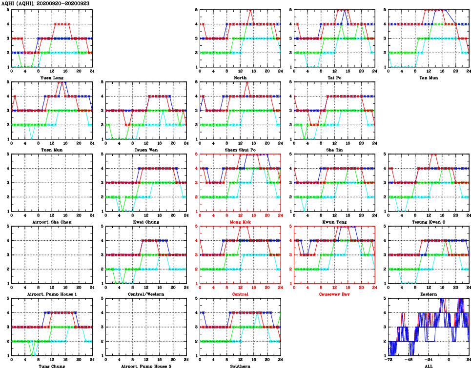 | Air Quality Data Time Series for AQHI (2020/09/23) | ( Line colors: Day -3 Day -2 Day -1 Current day ) | 2D Map Current AQHI |