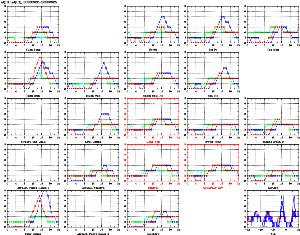 | Air Quality Data Time Series for AQHI (2020/09/25) | ( Line colors: Day -3 Day -2 Day -1 Current day ) | 2D Map Current AQHI |
