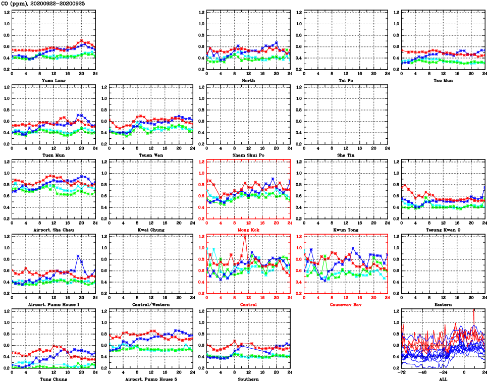 | Air Quality Data Time Series for CO (2020/09/25) | ( Line colors: Day -3 Day -2 Day -1 Current day ) | 2D Map Current AQHI |