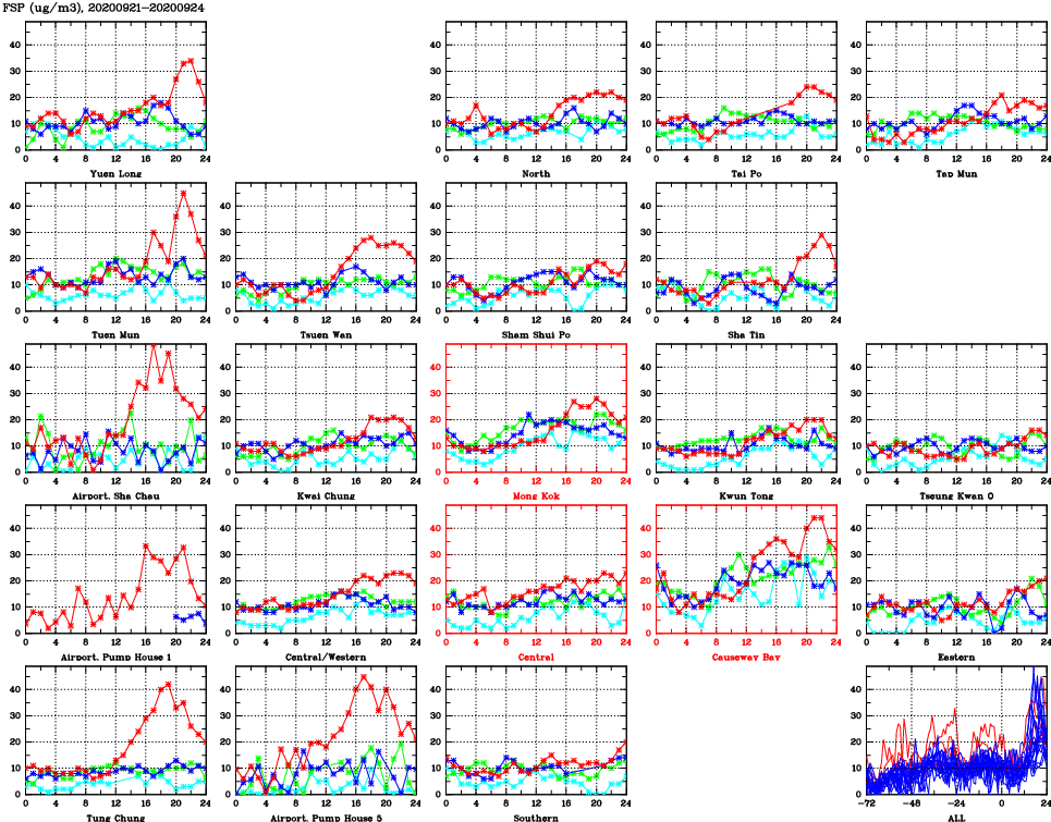 | Air Quality Data Time Series for FSP (2020/09/24) | ( Line colors: Day -3 Day -2 Day -1 Current day ) | 2D Map Current AQHI |