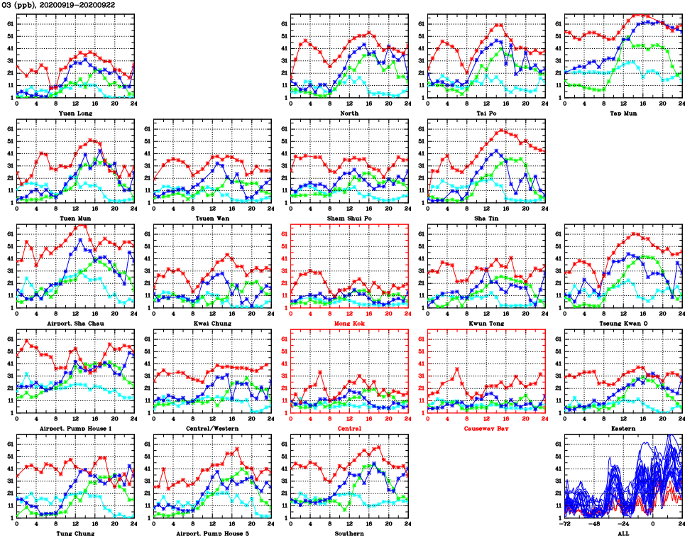 | Air Quality Data Time Series for O3 (2020/09/22) | ( Line colors: Day -3 Day -2 Day -1 Current day ) | 2D Map Current AQHI |