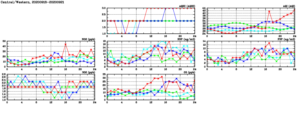 | Air Quality Data Time Series in Central/Western (2020/09/21) | ( Line colors: Day -3 Day -2 Day -1 Current day ) | 2D Map Current AQHI |
