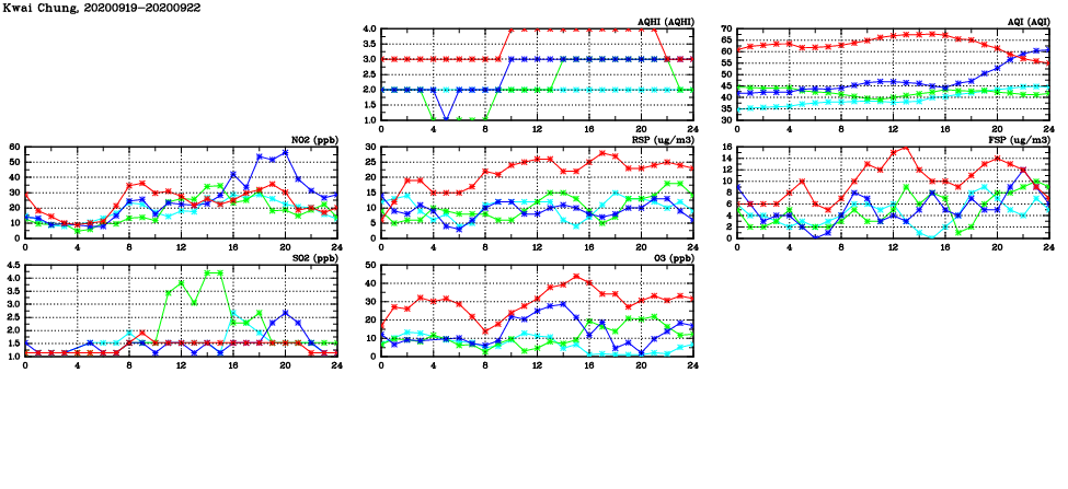 | Air Quality Data Time Series in Kwai Chung (2020/09/22) | ( Line colors: Day -3 Day -2 Day -1 Current day ) | 2D Map Current AQHI |