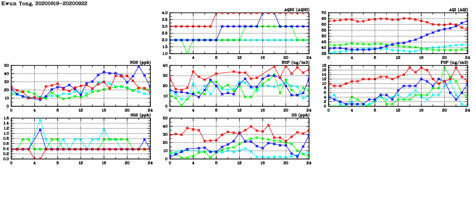 | Air Quality Data Time Series in Kwun Tong (2020/09/22) | ( Line colors: Day -3 Day -2 Day -1 Current day ) | 2D Map Current AQHI |