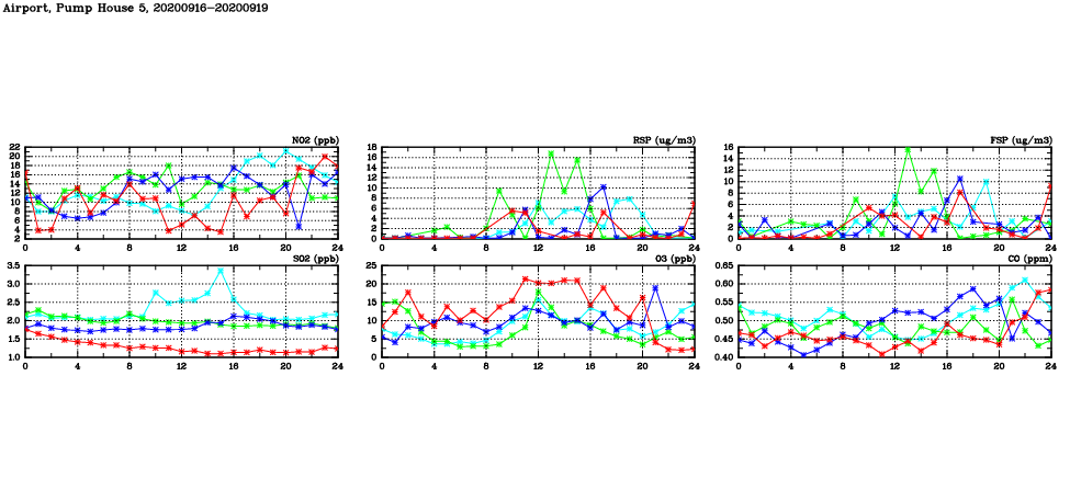 | Air Quality Data Time Series in Airport, Pump House 5 (2020/09/19) | ( Line colors: Day -3 Day -2 Day -1 Current day ) | 2D Map Current AQHI |