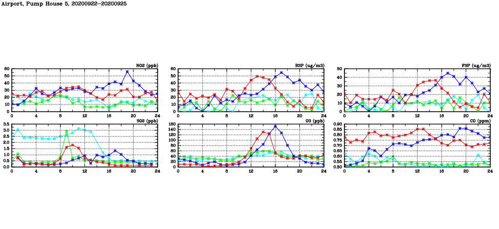 | Air Quality Data Time Series in Airport, Pump House 5 (2020/09/25) | ( Line colors: Day -3 Day -2 Day -1 Current day ) | 2D Map Current AQHI |