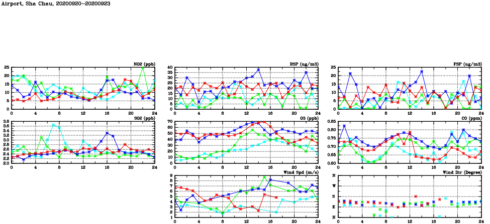 | Air Quality Data Time Series in Airport, Sha Chau (2020/09/23) | ( Line colors: Day -3 Day -2 Day -1 Current day ) | 2D Map Current AQHI |