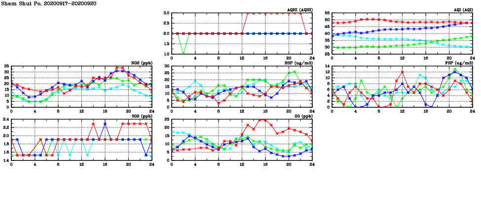 | Air Quality Data Time Series in Sham Shui Po (2020/09/20) | ( Line colors: Day -3 Day -2 Day -1 Current day ) | 2D Map Current AQHI |
