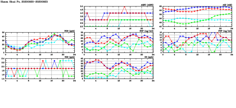 | Air Quality Data Time Series in Sham Shui Po (2020/09/23) | ( Line colors: Day -3 Day -2 Day -1 Current day ) | 2D Map Current AQHI |