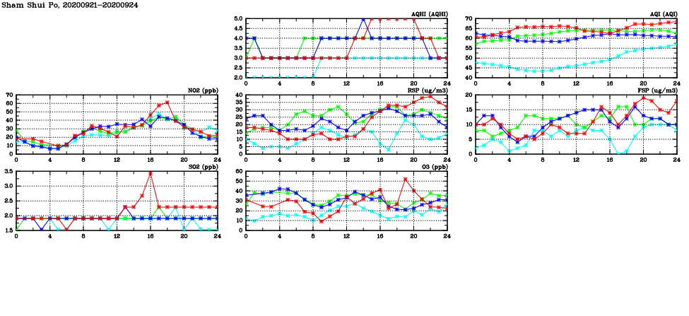 | Air Quality Data Time Series in Sham Shui Po (2020/09/24) | ( Line colors: Day -3 Day -2 Day -1 Current day ) | 2D Map Current AQHI |