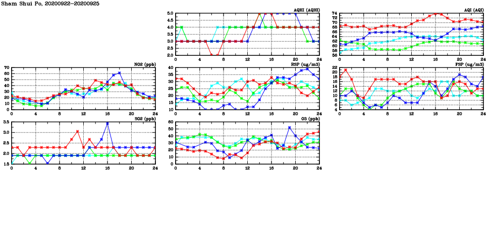 | Air Quality Data Time Series in Sham Shui Po (2020/09/25) | ( Line colors: Day -3 Day -2 Day -1 Current day ) | 2D Map Current AQHI |