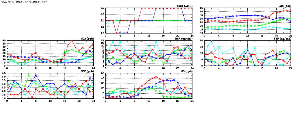 | Air Quality Data Time Series in Sha Tin (2020/09/21) | ( Line colors: Day -3 Day -2 Day -1 Current day ) | 2D Map Current AQHI |