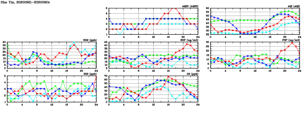 | Air Quality Data Time Series in Sha Tin (2020/09/24) | ( Line colors: Day -3 Day -2 Day -1 Current day ) | 2D Map Current AQHI |