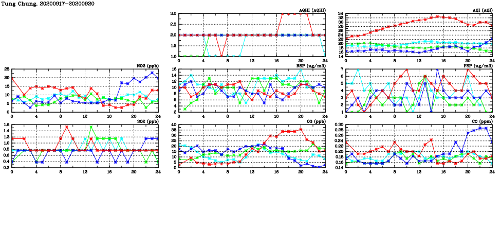 | Air Quality Data Time Series in Tung Chung (2020/09/20) | ( Line colors: Day -3 Day -2 Day -1 Current day ) | 2D Map Current AQHI |