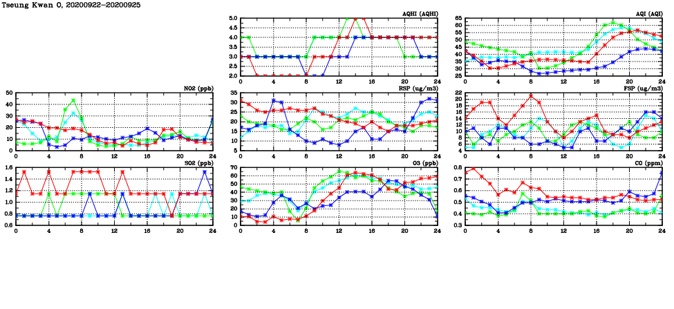 | Air Quality Data Time Series in Tseung Kwan O (2020/09/25) | ( Line colors: Day -3 Day -2 Day -1 Current day ) | 2D Map Current AQHI |