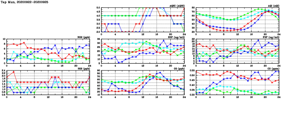 | Air Quality Data Time Series in Tap Mun (2020/09/25) | ( Line colors: Day -3 Day -2 Day -1 Current day ) | 2D Map Current AQHI |