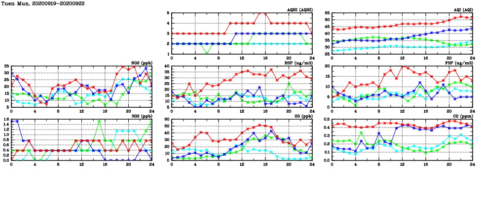 | Air Quality Data Time Series in Tuen Mun (2020/09/22) | ( Line colors: Day -3 Day -2 Day -1 Current day ) | 2D Map Current AQHI |
