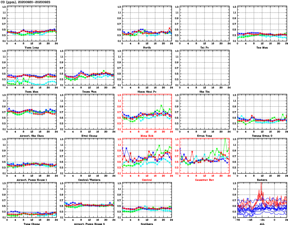 | Air Quality Data Time Series for CO (2020/09/23) | ( Line colors: Day -3 Day -2 Day -1 Current day ) | 2D Map Current AQHI |