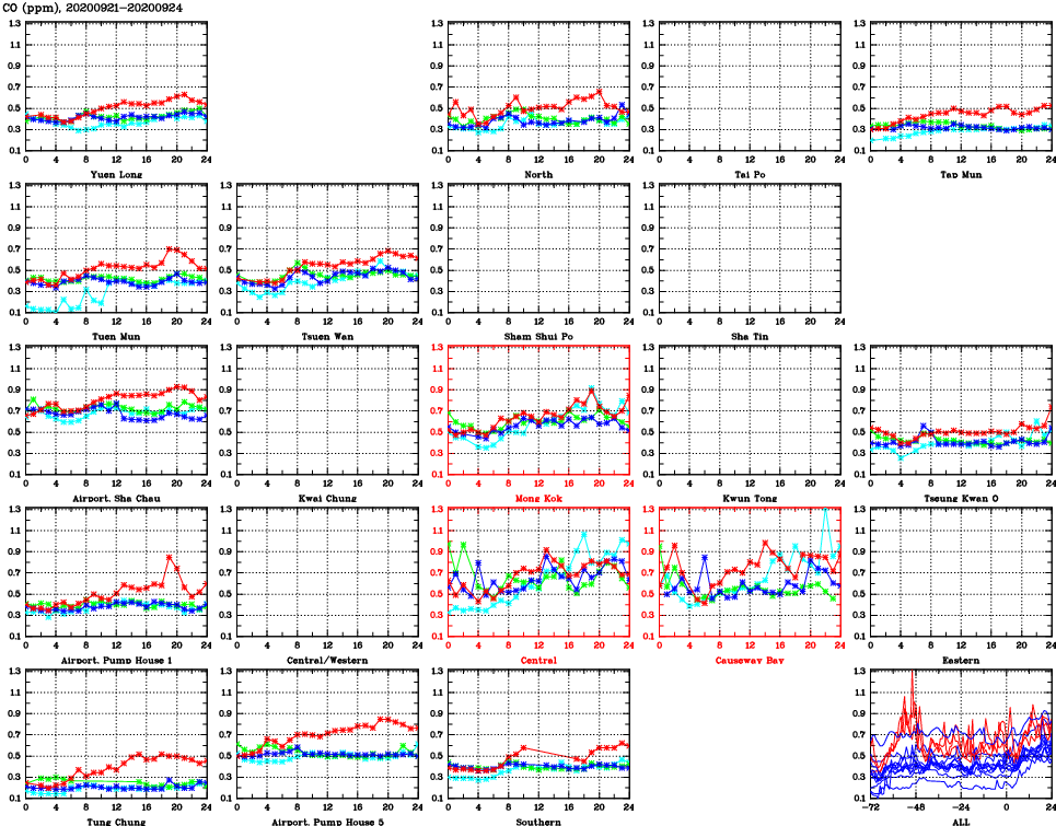 | Air Quality Data Time Series for CO (2020/09/24) | ( Line colors: Day -3 Day -2 Day -1 Current day ) | 2D Map Current AQHI |