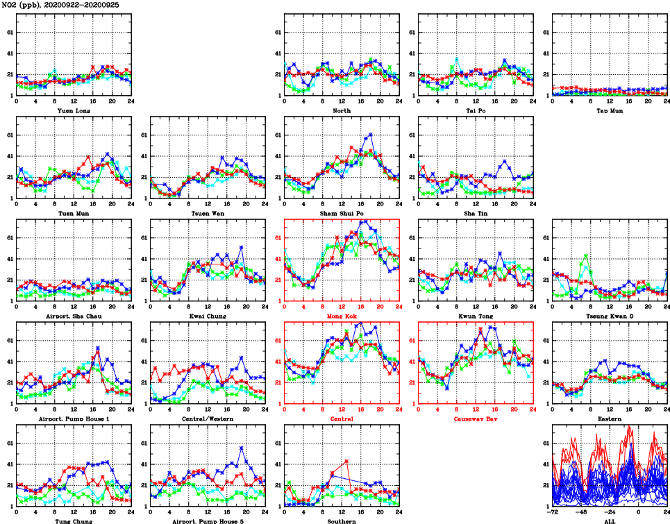 | Air Quality Data Time Series for NO2 (2020/09/25) | ( Line colors: Day -3 Day -2 Day -1 Current day ) | 2D Map Current AQHI |