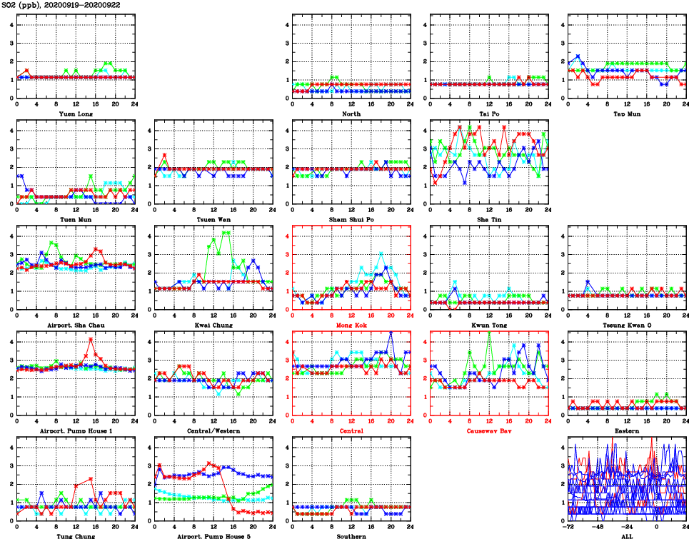 | Air Quality Data Time Series for SO2 (2020/09/22) | ( Line colors: Day -3 Day -2 Day -1 Current day ) | 2D Map Current AQHI |