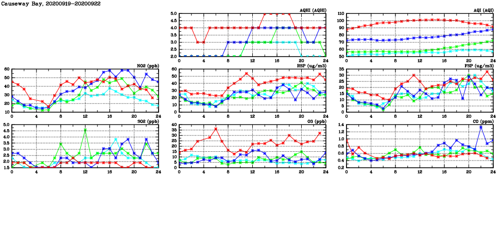 | Air Quality Data Time Series in Causeway Bay (2020/09/22) | ( Line colors: Day -3 Day -2 Day -1 Current day ) | 2D Map Current AQHI |