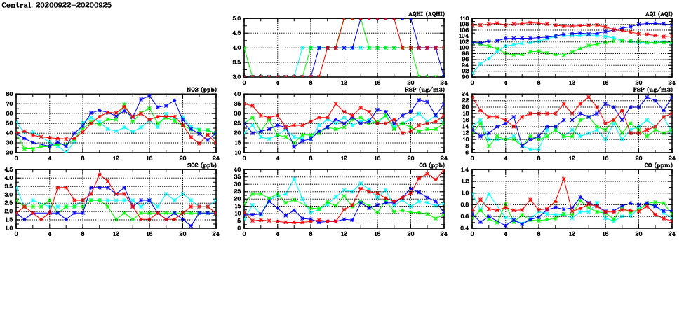 | Air Quality Data Time Series in Central (2020/09/25) | ( Line colors: Day -3 Day -2 Day -1 Current day ) | 2D Map Current AQHI |