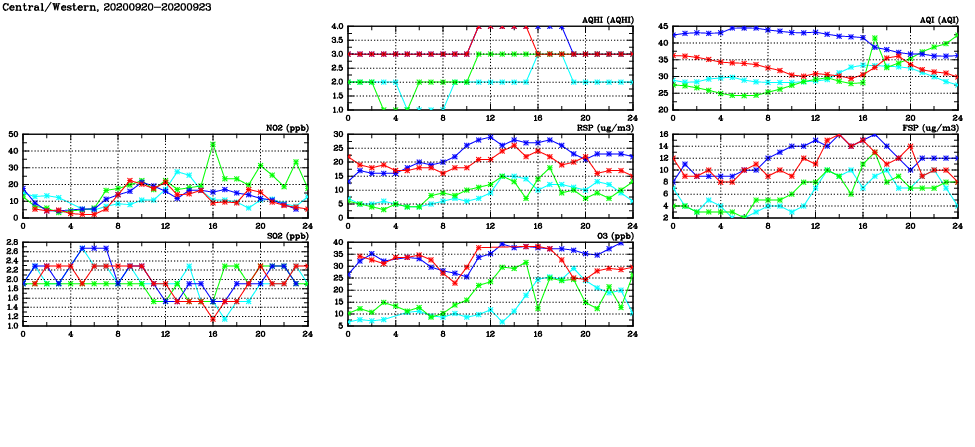 | Air Quality Data Time Series in Central/Western (2020/09/23) | ( Line colors: Day -3 Day -2 Day -1 Current day ) | 2D Map Current AQHI |