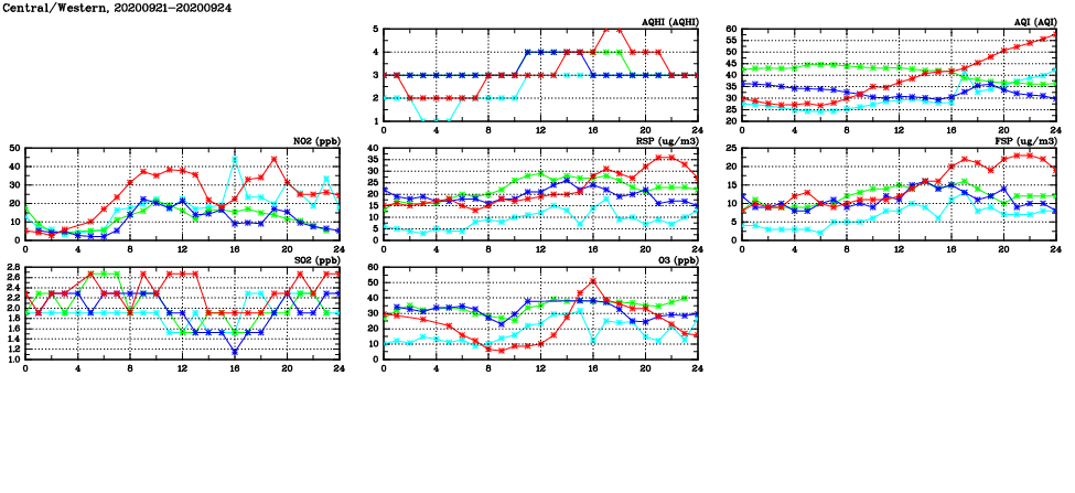 | Air Quality Data Time Series in Central/Western (2020/09/24) | ( Line colors: Day -3 Day -2 Day -1 Current day ) | 2D Map Current AQHI |
