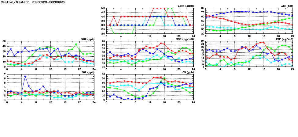 | Air Quality Data Time Series in Central/Western (2020/09/26) | ( Line colors: Day -3 Day -2 Day -1 Current day ) | 2D Map Current AQHI |