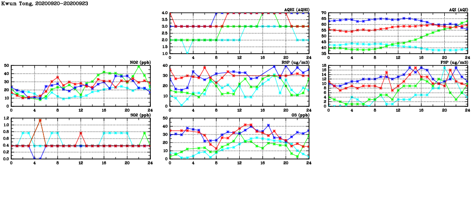| Air Quality Data Time Series in Kwun Tong (2020/09/23) | ( Line colors: Day -3 Day -2 Day -1 Current day ) | 2D Map Current AQHI |