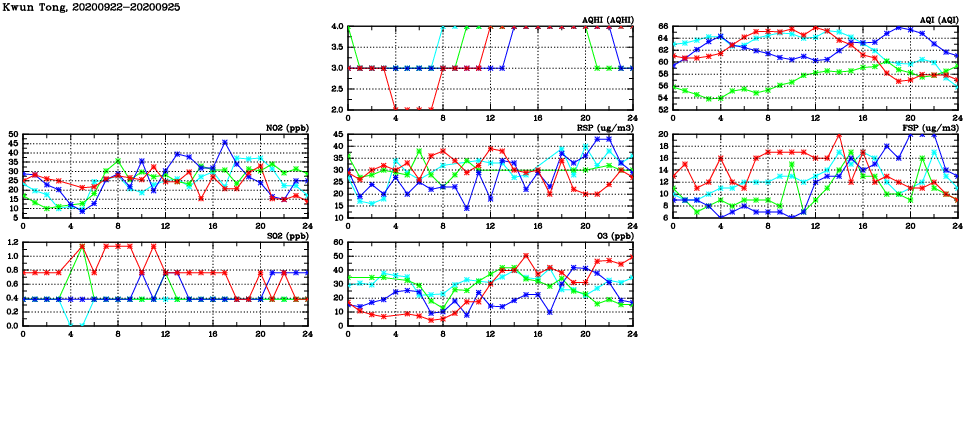 | Air Quality Data Time Series in Kwun Tong (2020/09/25) | ( Line colors: Day -3 Day -2 Day -1 Current day ) | 2D Map Current AQHI |