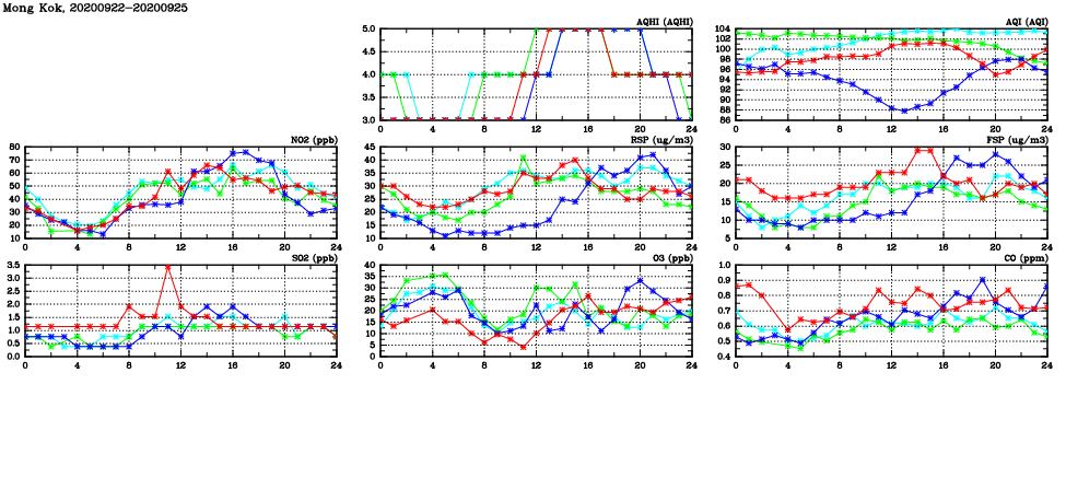 | Air Quality Data Time Series in Mong Kok (2020/09/25) | ( Line colors: Day -3 Day -2 Day -1 Current day ) | 2D Map Current AQHI |