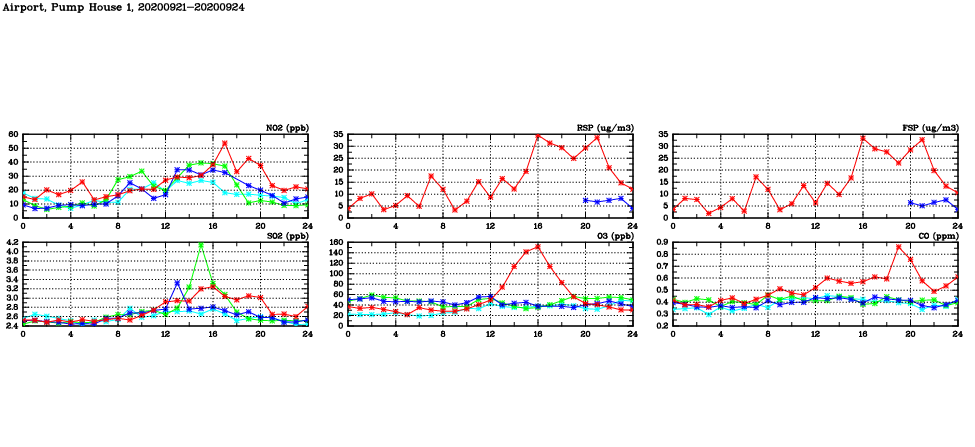 | Air Quality Data Time Series in Airport, Pump House 1 (2020/09/24) | ( Line colors: Day -3 Day -2 Day -1 Current day ) | 2D Map Current AQHI |
