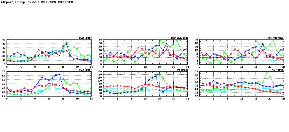 | Air Quality Data Time Series in Airport, Pump House 1 (2020/09/26) | ( Line colors: Day -3 Day -2 Day -1 Current day ) | 2D Map Current AQHI |