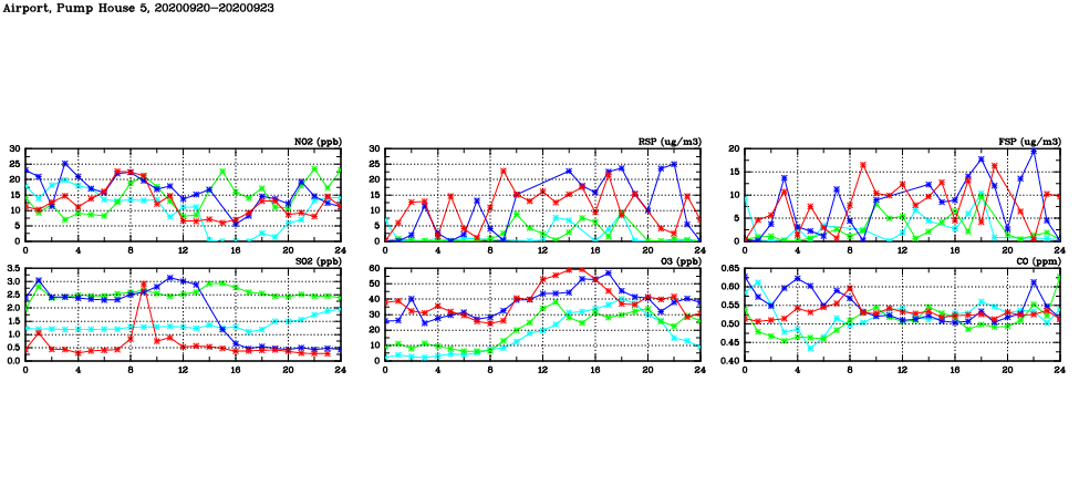 | Air Quality Data Time Series in Airport, Pump House 5 (2020/09/23) | ( Line colors: Day -3 Day -2 Day -1 Current day ) | 2D Map Current AQHI |