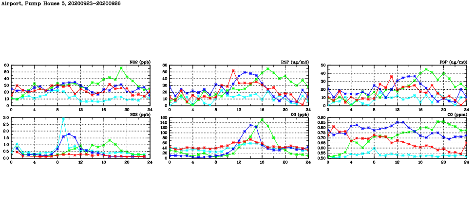 | Air Quality Data Time Series in Airport, Pump House 5 (2020/09/26) | ( Line colors: Day -3 Day -2 Day -1 Current day ) | 2D Map Current AQHI |