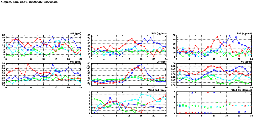 | Air Quality Data Time Series in Airport, Sha Chau (2020/09/25) | ( Line colors: Day -3 Day -2 Day -1 Current day ) | 2D Map Current AQHI |