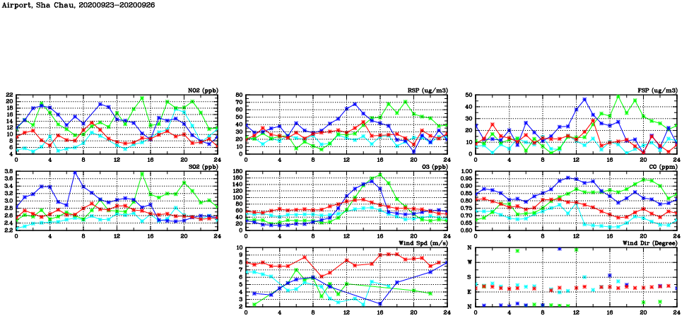 | Air Quality Data Time Series in Airport, Sha Chau (2020/09/26) | ( Line colors: Day -3 Day -2 Day -1 Current day ) | 2D Map Current AQHI |
