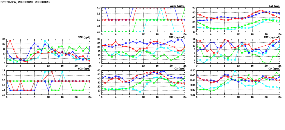| Air Quality Data Time Series in Southern (2020/09/23) | ( Line colors: Day -3 Day -2 Day -1 Current day ) | 2D Map Current AQHI |