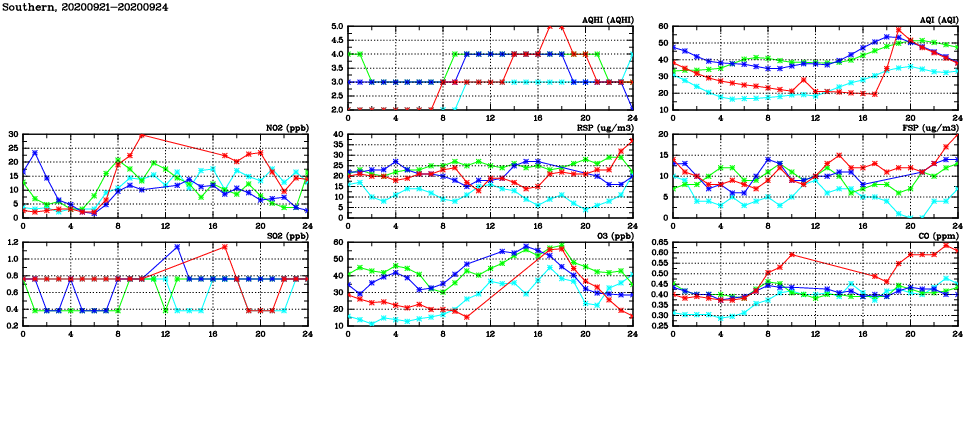 | Air Quality Data Time Series in Southern (2020/09/24) | ( Line colors: Day -3 Day -2 Day -1 Current day ) | 2D Map Current AQHI |