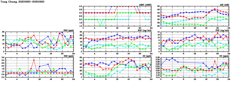 | Air Quality Data Time Series in Tung Chung (2020/09/23) | ( Line colors: Day -3 Day -2 Day -1 Current day ) | 2D Map Current AQHI |