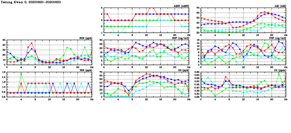 | Air Quality Data Time Series in Tseung Kwan O (2020/09/23) | ( Line colors: Day -3 Day -2 Day -1 Current day ) | 2D Map Current AQHI |