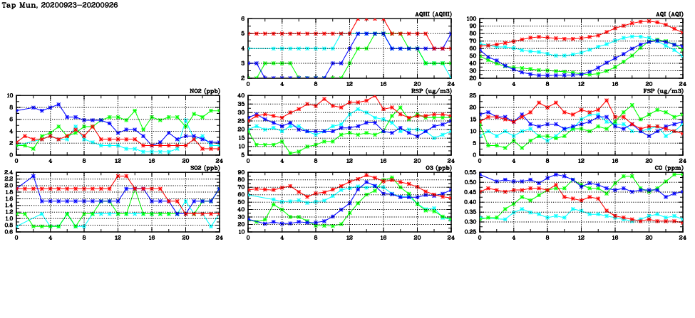 | Air Quality Data Time Series in Tap Mun (2020/09/26) | ( Line colors: Day -3 Day -2 Day -1 Current day ) | 2D Map Current AQHI |